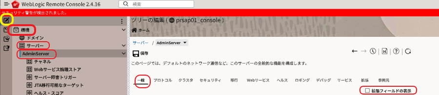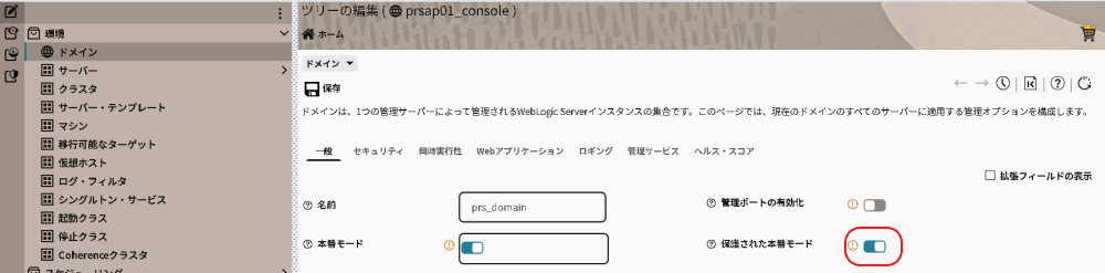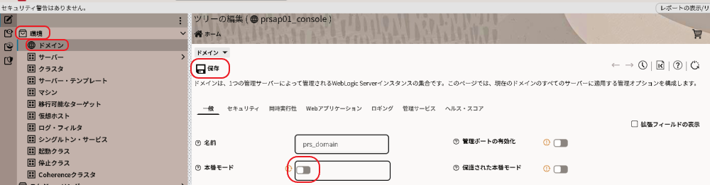 以前のバージョンと違って WebLogic14.1.2では「保護された本番モード」が「本番モード」のデフォルトに設定されています。「本番モード」をオンに変更して「保存」をクリックすると自動的に「保護された本番モード」もオンになるという、非常にデンジャラスな仕様変更です。