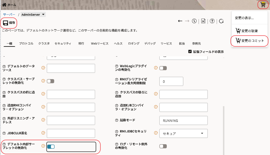 うっかりこの状態で Admin Serverを再起動すると面倒なことになるので「保護された本番モード」をオフに戻してもう一度「保存」、「カートマーク」-「変更のコミット」でコミットします。