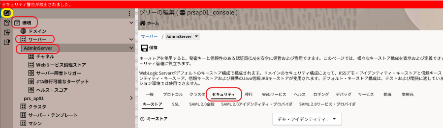 <2025/08/25 15時21分18,014秒 日本標準時> <Notice> <Security> <BEA-090171> <タイ プpkcs12のキーストア・ファイル/opt/app/oracle/config/domains/prs_domain/security/DemoIdentity.p12から別名DemoIdentityの下に格納されたアイデンティティ証明書と秘 密キーをロードしています。>
