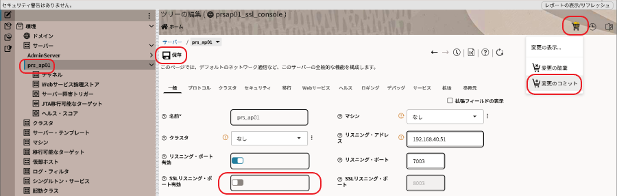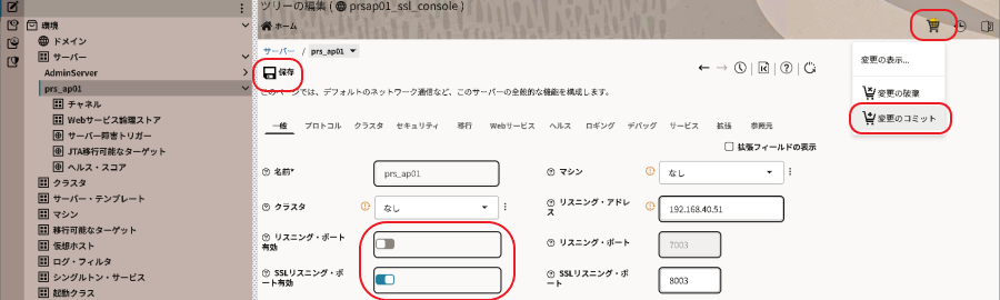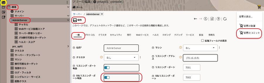 「ツリーの編集」でAdmin Serverの管理画面に移動して「SSLリスニング・ポート有効」をオンにして保存、コミットします。