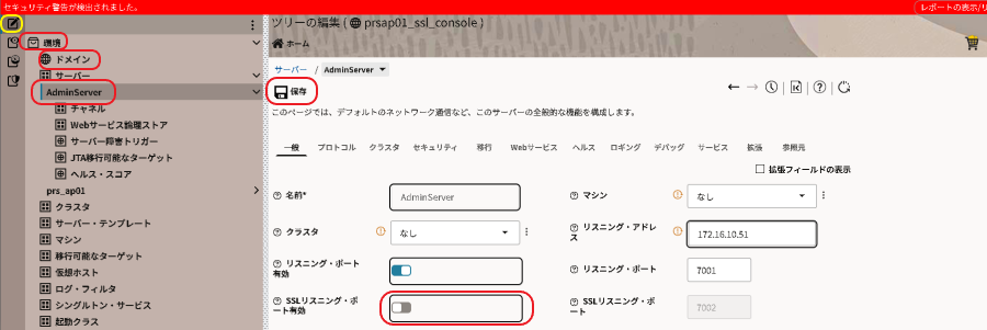WRCから Admin Serverに接続して「ツリーの編集」-「環境」-「サーバー」-「AdminServer」でAdmin Serverの管理画面に移動、「SSLリスニング・ポート有効」をオフにして「保存」します。