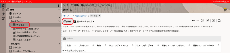 ツリーの「AdminServer」のすぐ下にある「チャネル」をクリックしてチャネル管理画面を開き「新規」をクリックします。