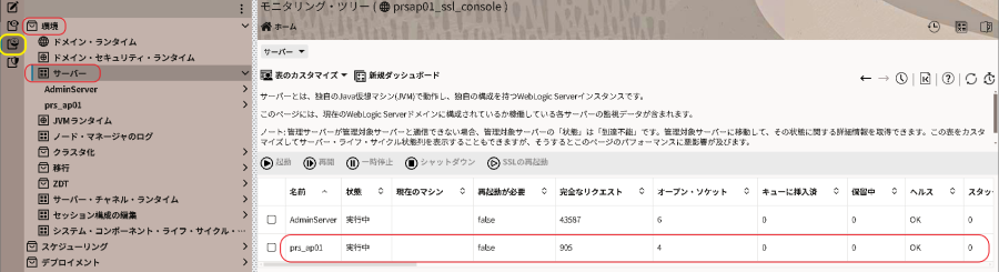 Managed Serverを起動して WRCで「モニタリング・ツリー」-「環境」-「サーバ」でサーバのモニタリング画面を表示します。Managed Serverのステータスが「実行中」と正しく表示されていれば OKです。